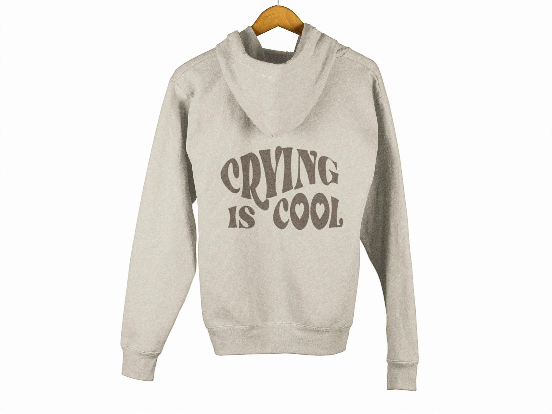 Beige Hoodie with chocolate brown logo in the back and left sleeve